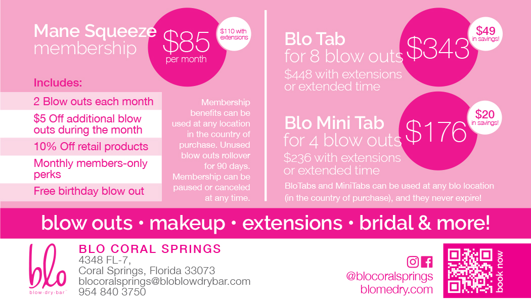 Blo Blow Dry Bar is North America’s first and largest blow dry bar, specializing in wash and blowouts, custom looks, hair extensions, hair tinsel, and a variety of hair treatments. We also specialize in Makeup Services. Located at 4348 FL-7 in Coral Springs, FL 33073. Serving Coconut Creek residents.