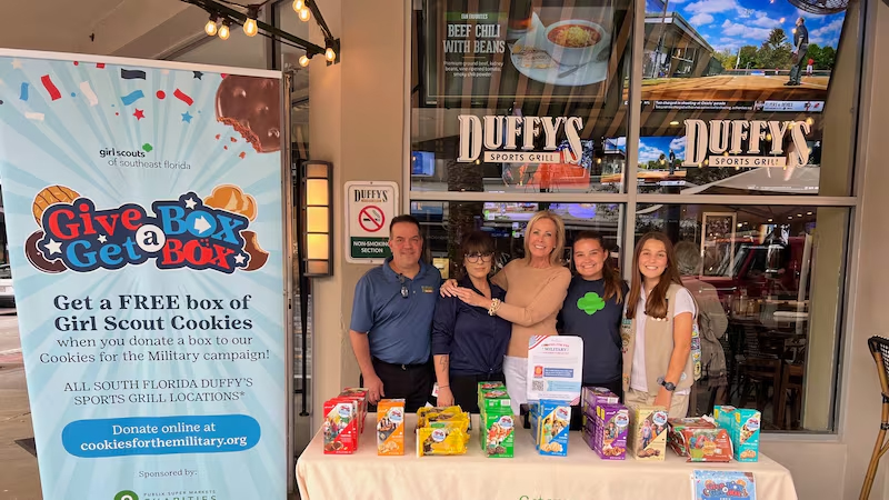 “Give a Box, Get a Box is a powerful way for our community to show appreciation for the men and women in uniform,” said Lisa Johnson, CEO of Girl Scouts of Southeast Florida. “Our long-standing partnership with Duffy’s Sports Grill has helped us deliver tens of thousands of boxes of cookies to military members since the program began, and we are proud to continue this meaningful tradition.”