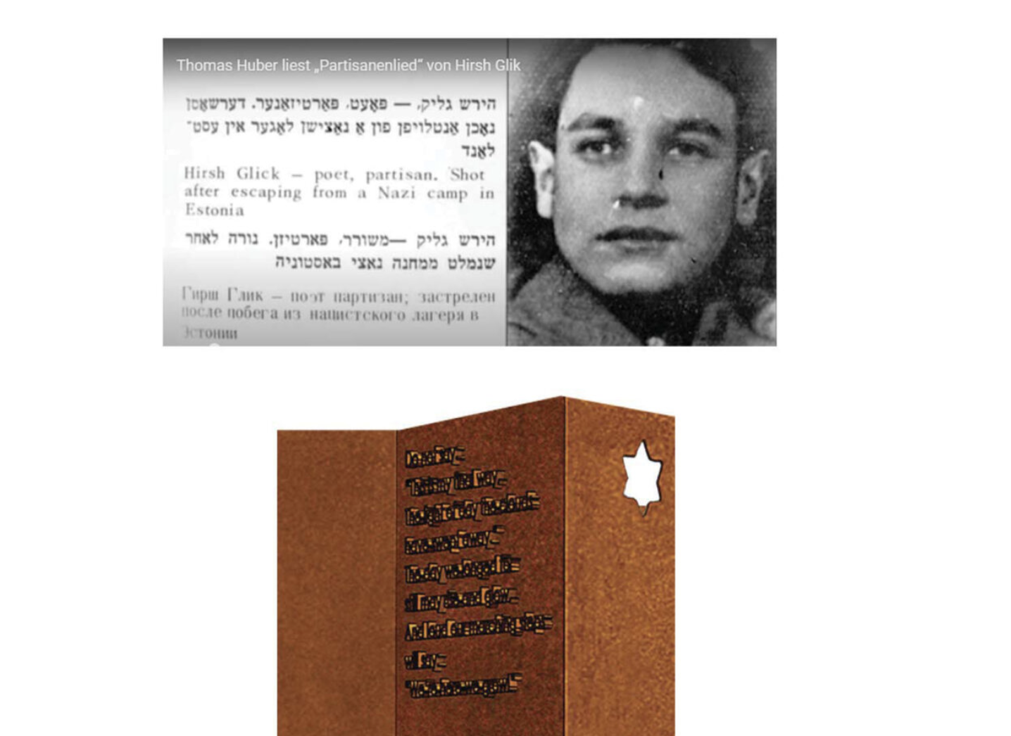 Also etched into the metal is a poem written in 1943 by Hirsh Glick, a young Jewish partisan whose words became an anthem of resistance during the Holocaust.
