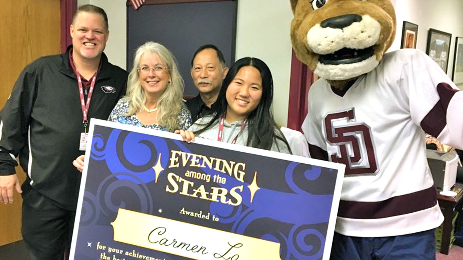 Marjory Stoneman Douglas student Carmen Lo is honored for perfect attendance. Her father is also pictured.