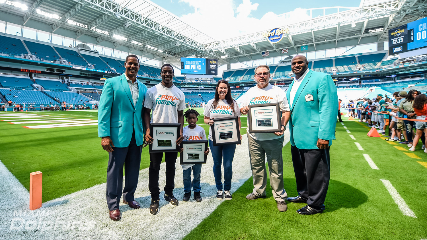 For each home game, the Dolphins identifies a high school coach of the week, high school player of the week, youth player of the week and team mom of the week.