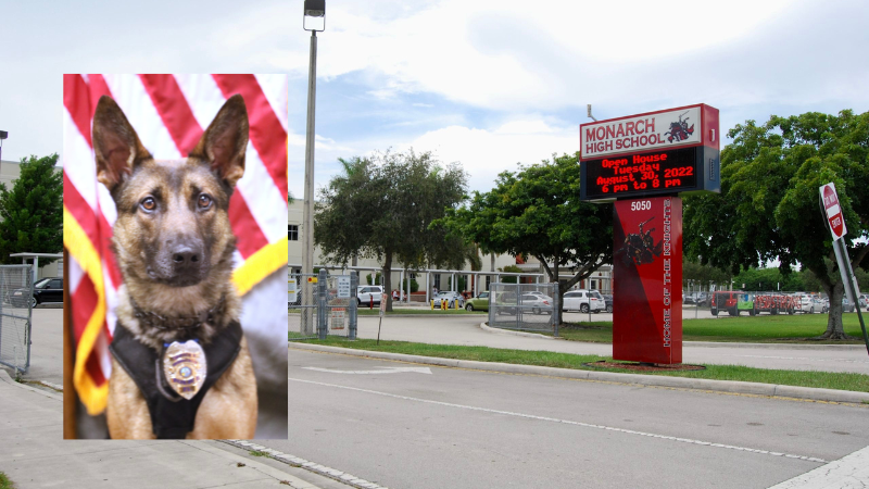 A silent alarm at Monarch High School early Saturday led to a swift police response and a quick surrender—thanks to one very persuasive police dog.
